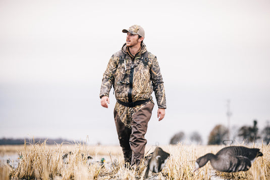 Buckshot Eqwader 1600 Neoprene Wader 3.0: A man in camouflage gear with a hat and backpack, showcasing the durable, waterproof wading system in a field.