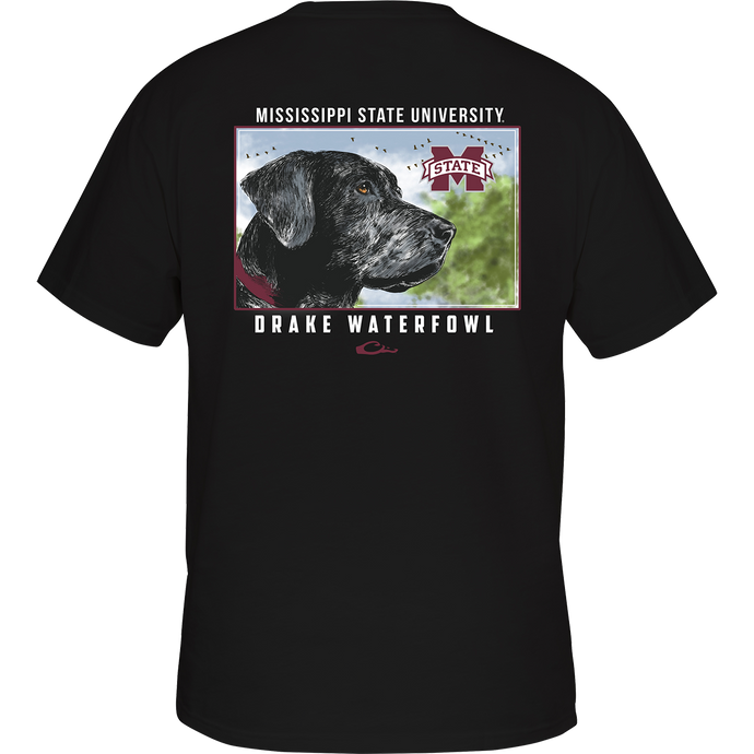 Man's best friend. Our cotton/poly blend tee has a black lab head scene on the back with your school’s logo, sch...
