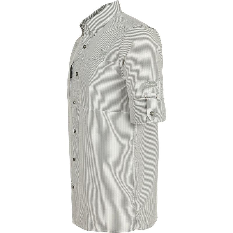 Classic Seersucker Stripe Shirt L/S: A button-down collar shirt with a hidden zippered chest pocket and Magnattach™ closure. Vented cape back for ventilation. Classic Seersucker Stripe Shirt L/S, a close-up of a green and white striped shirt with a button-down collar and hidden zippered chest pocket. Classic Seersucker Stripe Shirt L/S: A button-down shirt with a seersucker texture, UPF 30 sun protection, and moisture-wicking fabric. Features a hidden zippered chest pocket and a Magnattach™ closure. Vented cape back for ventilation. A classic seersucker stripe shirt with a button-down collar, hidden zippered chest pocket, and Magnattach™ closure. Made from performance fabric for moisture-wicking and UPF30 sun protection. Vented cape back and split tail hem for ventilation and versatility. Perfect for hunting, fishing, and casual wear. Close-up of the Drake Classic Seersucker Stripe Shirt, a soft and featherweight performance shirt with UPF30 sun protection, moisture-wicking fabric, and a hidden zippered chest pocket. Classic fit with a button-down collar and vented cape back. Perfect for hunting and outdoor activities. Classic Seersucker Stripe Shirt L/S: A close-up of a shirt with a button-down collar, hidden zippered chest pocket, and Magnattach™ closure. A close-up of the Classic Seersucker Stripe Shirt L/S, featuring a textured pattern and button-down collar. Made from 72% Polyester and 28% Nylon, it offers UPF30 sun protection, moisture-wicking, and quick-drying properties. With a vented cape back and hidden zippered chest pockets, this shirt combines performance and timeless style. Perfect for hunting, fishing, and casual wear. A close-up of the Drake Classic Seersucker Stripe Shirt, featuring a button-down collar, hidden zippered chest pocket, and Magnattach™ closure. Made from 72% Polyester and 28% Nylon, this soft and featherweight shirt offers UPF30 sun protection and moisture-wicking properties. With a vented cape back and split tail hem, it provides comfort and versatility. Perfect for big game hunting, waterfowl hunting, turkey hunting, and fishing.