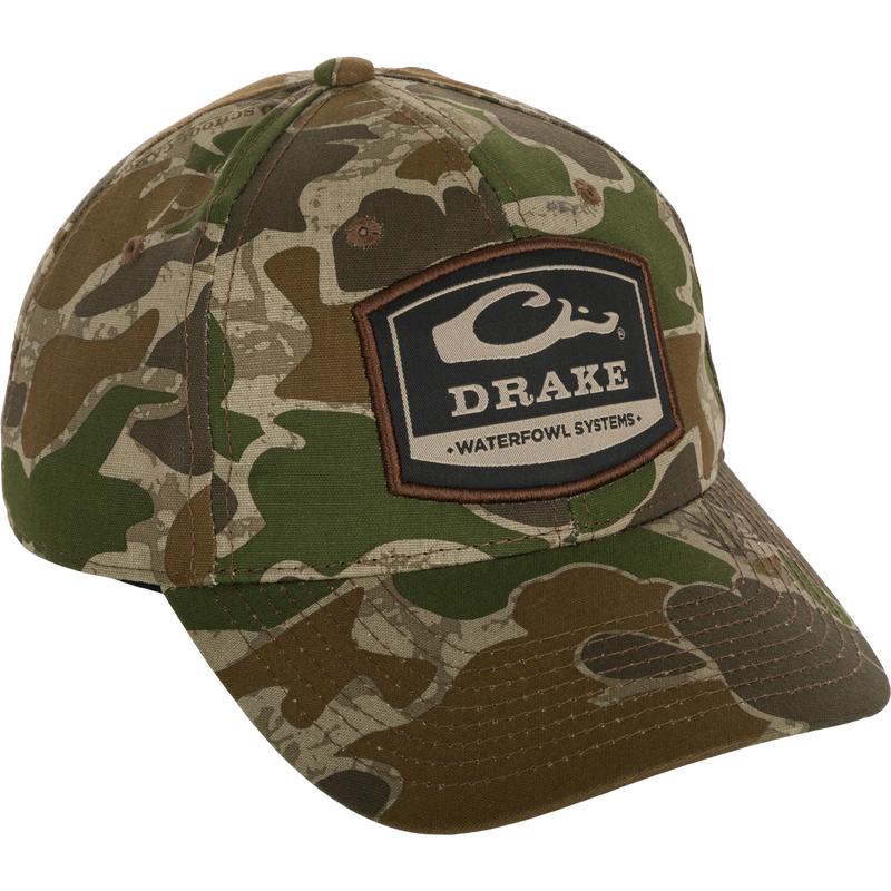 A 6-Panel Badge Cap with a camouflage pattern and logo, perfect for outdoor enthusiasts. Made of cotton blend panels, it features a secure fit with a rear snap closure.