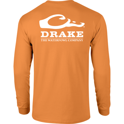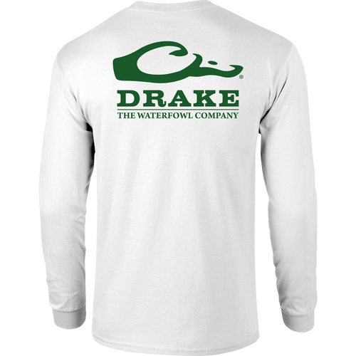 Drake Icon Long Sleeve Performance Crew, a lightweight polyester shirt with UPF 50, moisture-wicking, and Drake logo on front, ideal for outdoor activities.