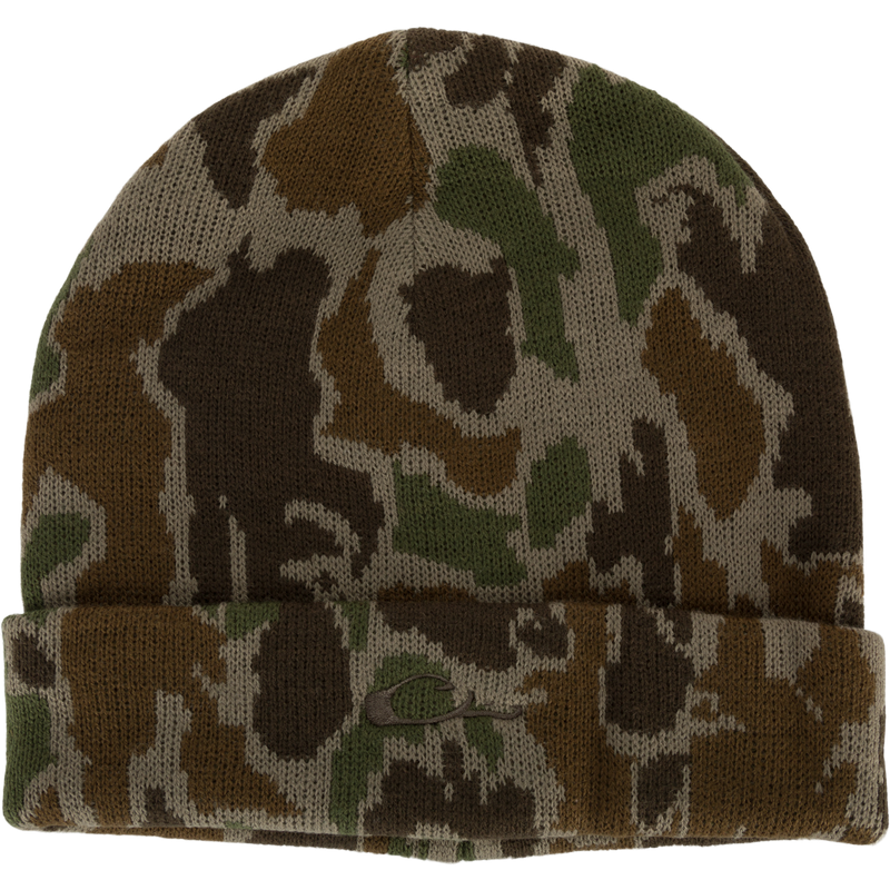 LST Acrylic Beanie from Drake Waterfowl: Camouflage knit fabric with 3mm foam stitch, featuring a flat stitch Drake logo. Ideal for outdoor activities, one-size-fits-most design for superior comfort and warmth.