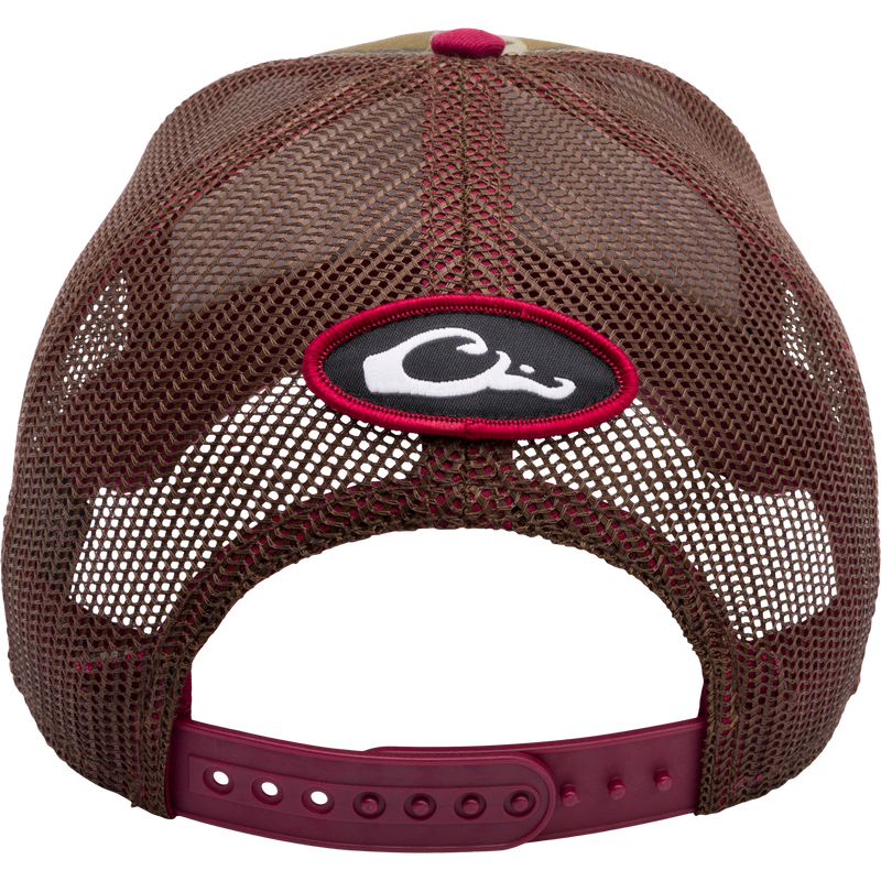 The Drake Mossy Oak Bottomland Mesh Back Trucker is a spun polyester twill-structured six-panel cap combined with mesh panels and features the Iconic Mossy Oak Bottomland Camo pattern.  It is constructed in a traditional trucker shape with a low profile and a slightly curved X-Peak stacked visor. The college logo is embroidered with 3D construction and has a back snap-back closure for adjustability.