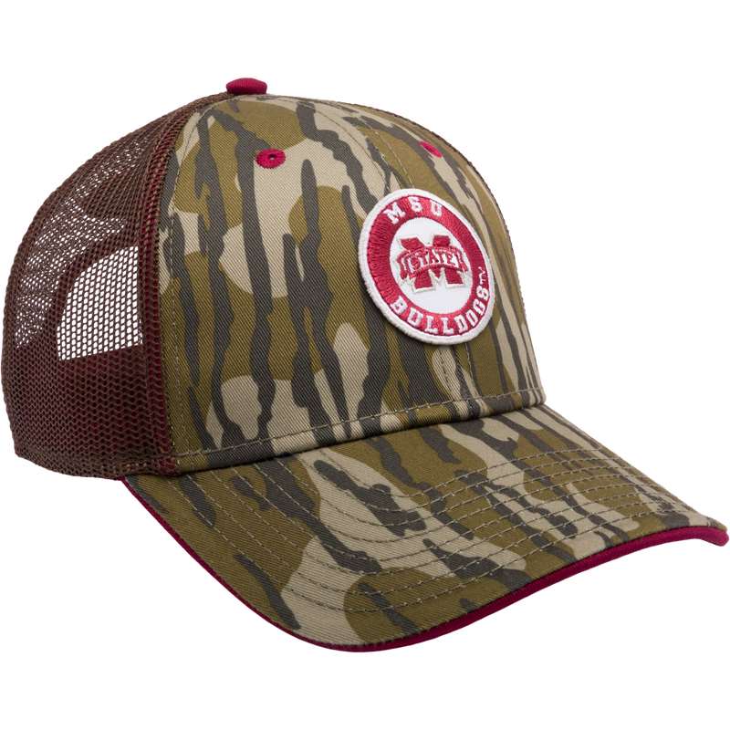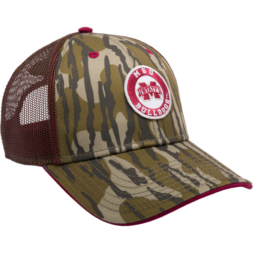 A Mississippi State Bottomland Mesh Back Cap featuring Mossy Oak Bottomland Camo pattern. Structured with poly twill front, mesh back, X-Peak visor, and 3D embroidered college logo. Snap-back closure. A Mississippi State Bottomland Mesh Back Cap by Drake Waterfowl, featuring Mossy Oak Bottomland Camo pattern, embroidered college logo, structured crown, mesh back, and adjustable snap-back closure.