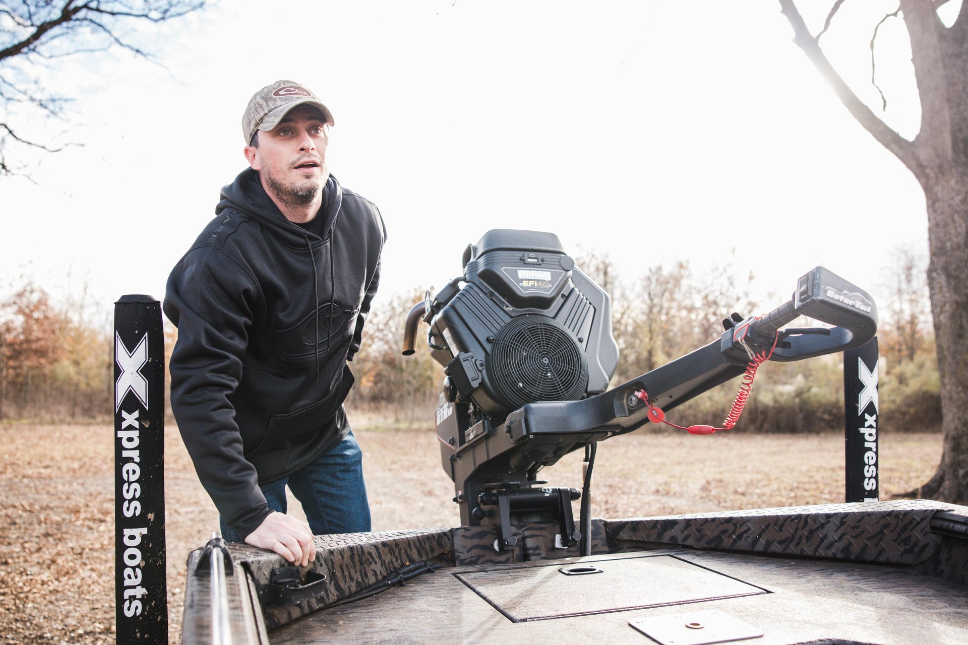 Man standing on a machine wearing the Drake Back Eddy Embossed Logo Hoodie, featuring a raised logo, kangaroo pocket, and adjustable hood with drawstrings.